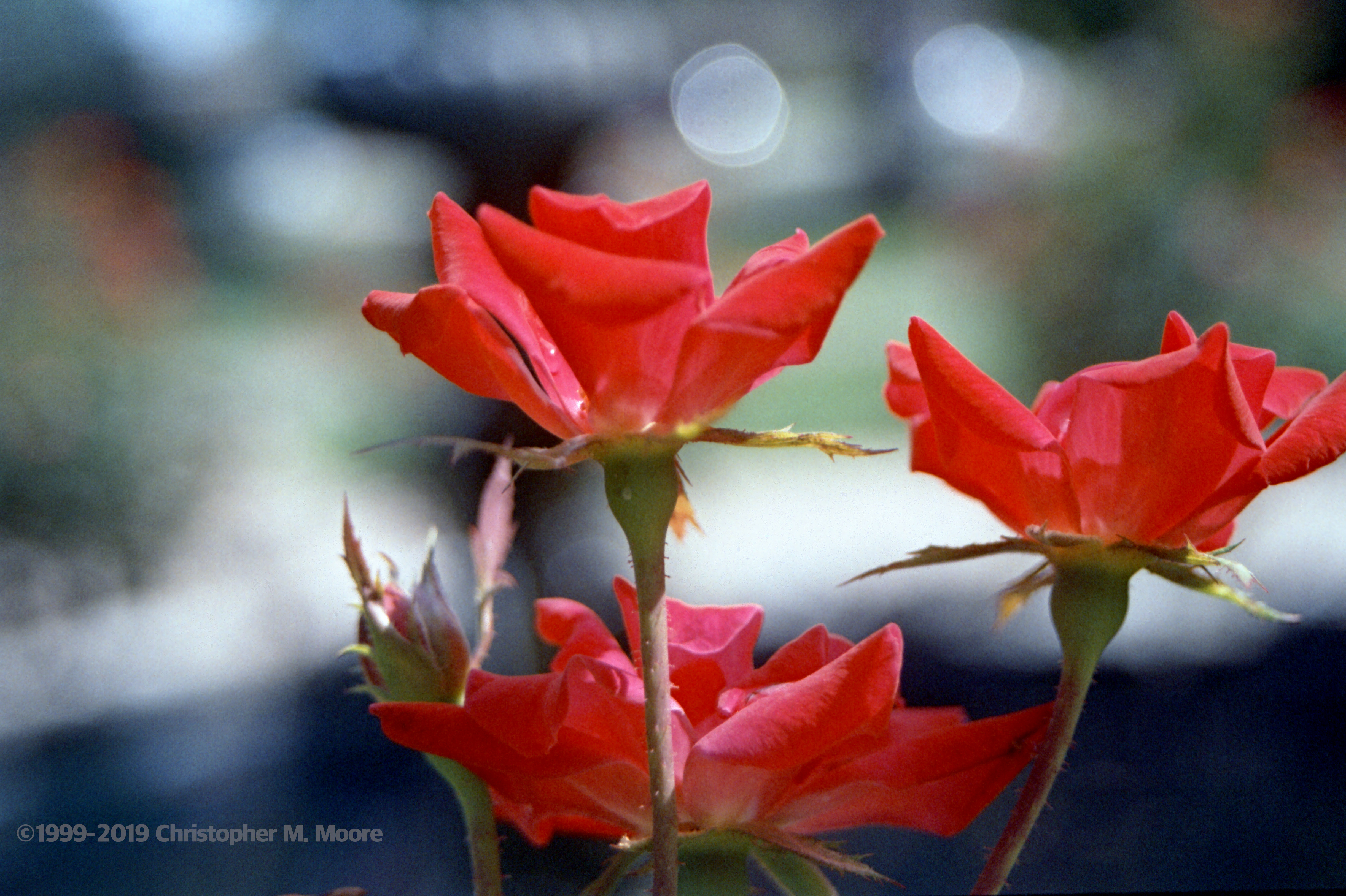 A trio of roses shot in sweltering August heat at the Shelter Gardens in Columbia, Missouri. Shot on Fuji Superia 400 X-Tra film and developed at home in my personal photo lab (A.K.A. the hall bathroom) in Unicolor C-41 chemistry on the Canon Rebel 2000. Shoot photos, not each other!