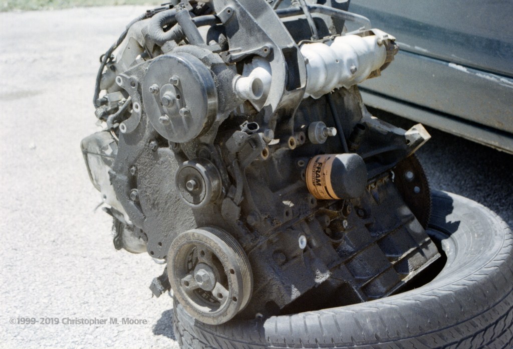 A General Motors 3400 SFI V6 engine. In the middle of an auto shop parking lot. On top of a tire. Shoot photos, not each other!