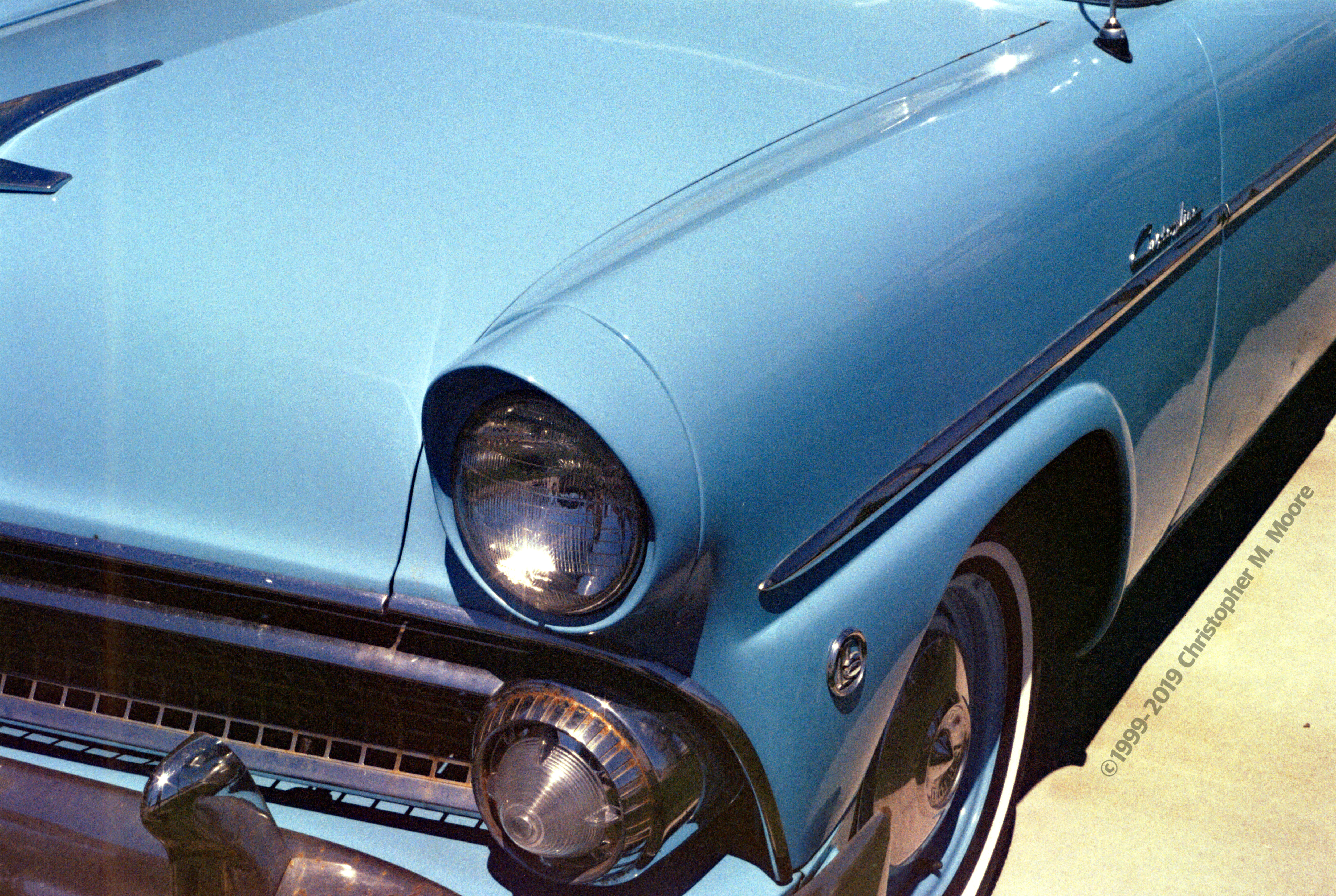 A 1955 Ford Customline on Kodak ColorPlus 200 film using a Pentax ME Super and a very inexpensive 50mm lens. Shoot photos, not each other. A retro photo on a retro camera using very retro-looking film.