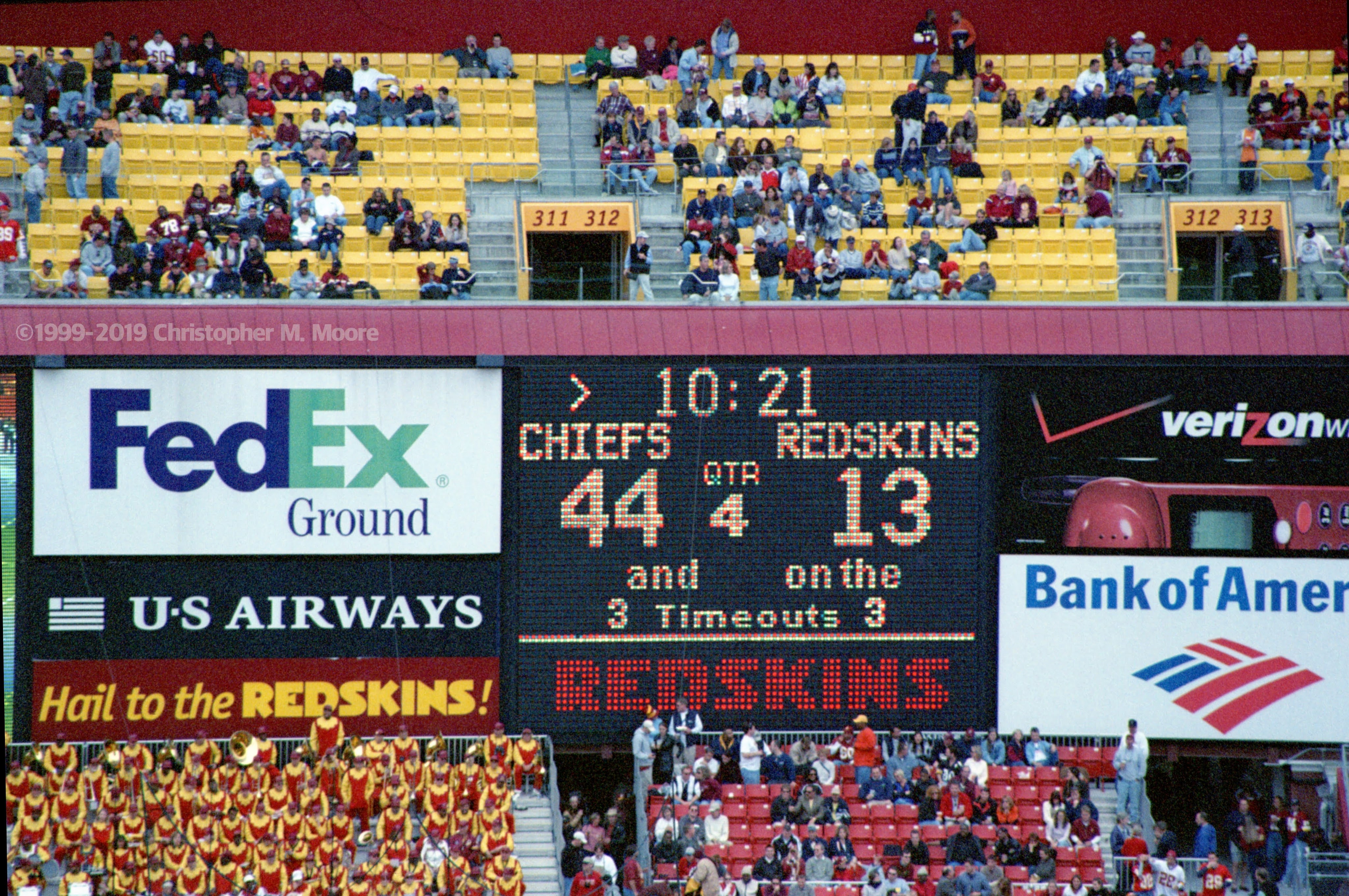 This one’s dedicated to American NFL fans, in particular fans of the Kansas City Chiefs – members of the Chiefs Kingdom in a place that was my home town for a young decade of life long ago. It is the 4th quarter of the Redskins game at FedEx Field decades before even coming close to any Super Bowl, September 30, 2001. The game was attended by my father (gone one year ago today) and myself. It was just after the final touchdown of the 4th quarter, shortly before the conversion that would give the final score of 45-13 Kansas City. If I recall, one of the first NFL games to resume after the 9/11 terrorist attacks. Lee Greenwood sang at halftime in front of a giant American flag. (That poor guy seriously needs another hit.) For those into old Chiefs Kingdom lore, this game is significant as it was one of those awkward occasions where former Chiefs head coach titan Marty Schottenheimer faced off with the Chiefs as the coach of some other team, in this case the Washington Redskins (or whatever politically correct non-offensive name they end up choosing next season). I wanted to see what my zoom lens could do – at a range of 300mm, I am sitting at one end of the stadium zoomed in on the other. Redskins fans are not as loyal as Chiefs fans – the stadium starts emptying out when they get to losing badly. I originally wanted to air this post on this date, as a second part after this one, but that one seemed to fit better as a father’s day post. Being that my dad and brother are both die-hard Chiefs fans, this one seems just as fitting for today. Shoot photos, not each other!