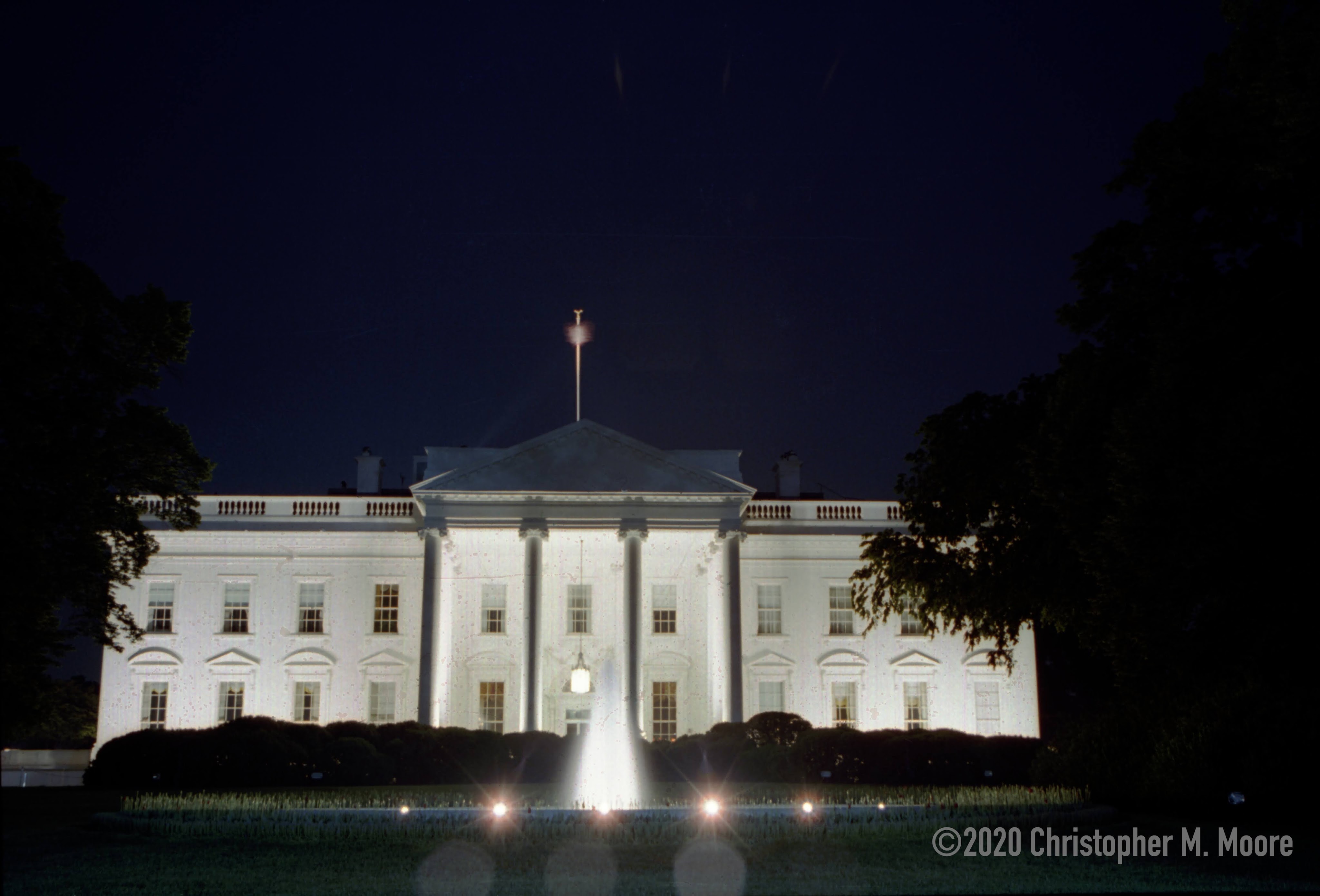 This 30-second exposure was shot in July of 2000 at about 11:00 on a very windy Washington night during the last few months of the rocky tenure of the Clinton administration, controversial then as the Trump administration is now. You can see how windy it was by the blurry flag. The DC police stopped me from taking more pictures. As a tourist on the streets of downtown Washington of course I could take what I wanted, but the problem was I had a leg of my tripod going beyond the fence and on the White House lawn and I had the camera lens protruding between the fence bars, both of which, as I learned that night, were no-nos. I complied and shot everything else farther away, no harm done. The picture was purely experimental and I don’t honestly consider it good. In all this time, it’s never been seen. But it has a strange and bizarre quality to it that mirrors the strange and bizarre times that we’re part of now in America.