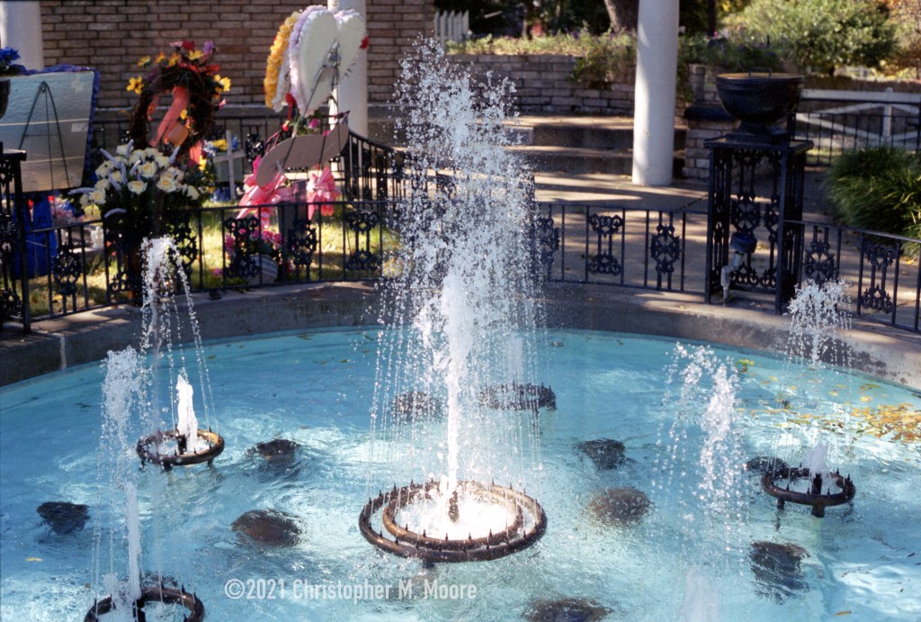 For those that have visited Graceland, this is the fountain by the grave site of the one and only Elvis Aron (it really is misspelled) Presley. Shot in November 2002 in the off-peak tourist season, there was nearly nobody to be found. Though nobody was in site, I felt a hard nudge on my shoulder and I could swear that another person was present when I shot this. Even though it was blustery cold, I was burning up hot. Does the ghost of Elvis come out to greet tourists? For the conspiracy theorists, it’s unthinkable. For the cynics, it’s impossible. For the rest of us, it’s folklore. There was a small group there and everybody seemed more interested in being inside where it was warm, so there were no witnesses. Though if he were still around on his 85th birthday he might urge fans to shoot photos, not each other.