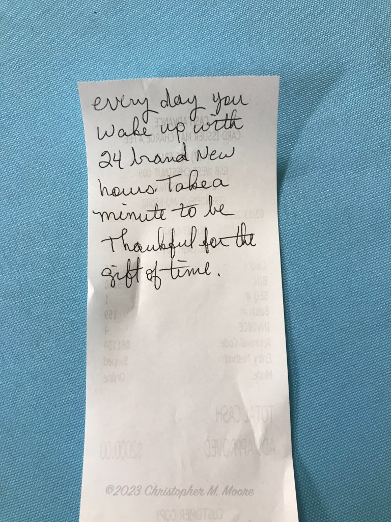 I was at a pharmacy one day. I made it to the counter to pick up my prescriptions and this note, written on the back of a cash advance receipt, was just sitting at the counter. It was very moving at the time. I didn’t keep it. Since it had financial information on the other side, the lady working that day dutifully took it and shredded it to protect customer privacy. Before she did that, I took a picture on my iPhone.