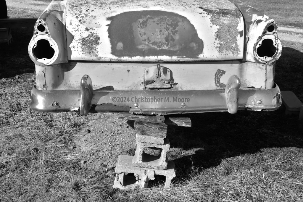 Moving through my year long series of vintage cars from the same rural dealership, I mentioned that most, but not all was shot on film. This one was not shot on film and it just didn’t feel good as color. Absurdly, it’s a broken down Ford that is propped up on this shaky stack of concrete blocks. I decided not to approach it any closer, fearing I might knock it down. Shoot photos, not each other!