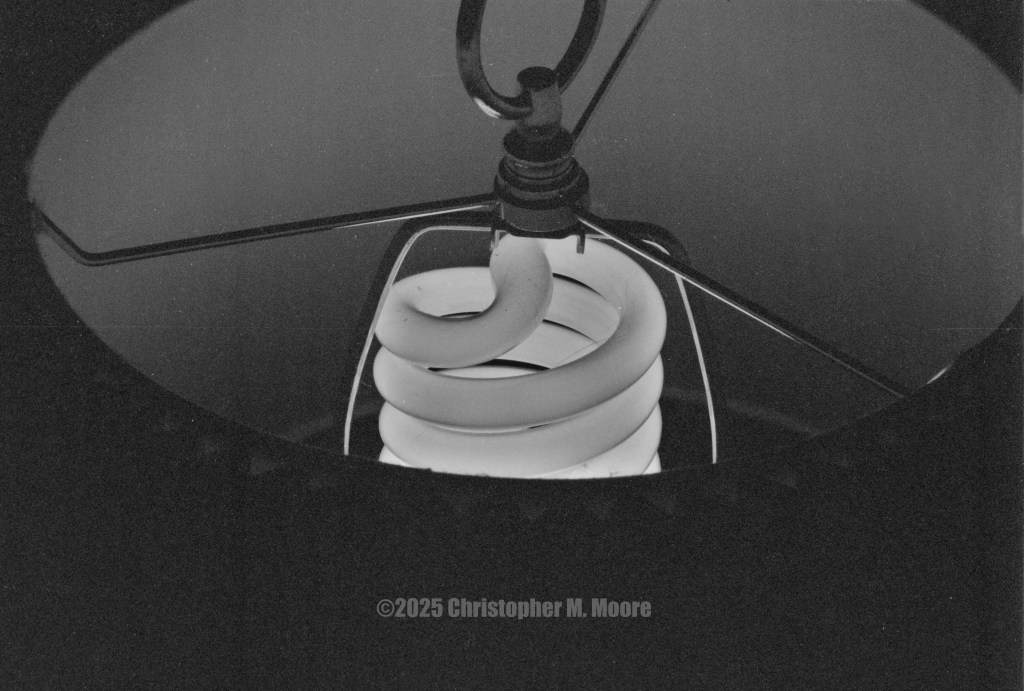 The only reason I took this picture is because I was trying to test the shutter of my Pentax MV at very high speeds. Typically, if they’re going to fail, it’s going to be around 1/1000 of a second or so. Being fully automatic, there’s no way to manually set this. So, the solution is to aim it at the brightest thing you can find and see if you get an image or not. In this case, the top of our lamp was the brighest thing to focus on. The image just came out very psychedelic looking on black and white film. Shoot photos, not each other!