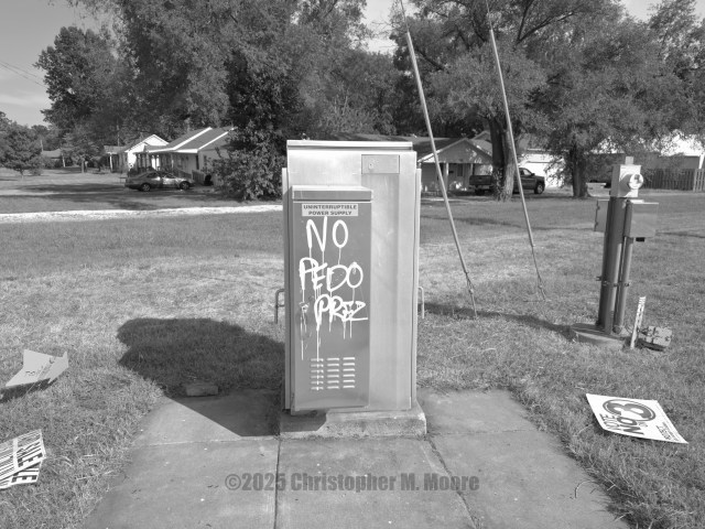 Why black and white when the picture came from a big new iPhone known for capturing color extraordinarily well? A stylistic choice. For one, we’re wrapping up one of the hottest midwestern summers on record. That means, there’s just not a lot of color to see. The grass is dying fast, the trees are green, and there’s only some blue sky. I must be honest with the audience – I try not to bring too many political opinions to my site, but they still show up because art is sometimes political. I did not vote for Trump in 2016 or 2020. I did not vote for him in 2024 either. The first amendment does guarantee such liberties as protesting your leadership – though that does not make defacing public properly legal. A sign of your own lawfully obtained materials would have been a more constitutionally friendly choice than a public power station.