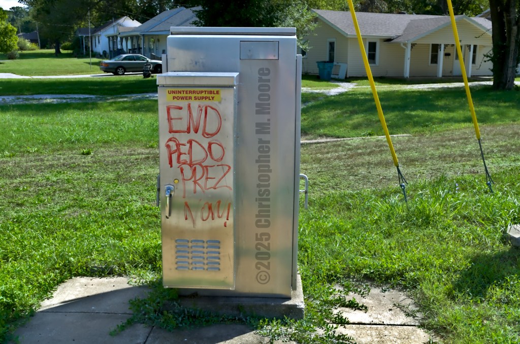 Not long ago I posted this picture of graffiti on a local power station. I shot that picture on my phone, and I decided I wanted to take another lunchtime work walk today with my Nikon camera to take something a bit better. To my surprise, it had been cleaned up. Not only that, but different graffiti was there. It did not appear to be spray painted this time. To be truthful, I’m not sure I want to know what was used here because I am not a hundred percent sure it was paint. As I said before, the first amendment of the U.S. Constitution does cover this sort of free speech. As before, the choice of defacing public equipment is questionable. Doing it in what appears to be blood (I sure wasn’t about to touch it) is even more so.