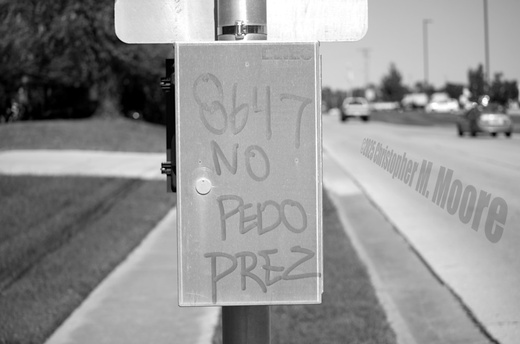 I have no idea what the significance of “8647” is here. I can’t decide if the person doing this is a weirdo or a spirit animal. I do know one thing – they aren’t afraid to make known to this neighborhood that I work in exactly how he feels about Donald Trump, even in one of the most conservative towns in the middle of America. For that, I salute you. For the record, you aren’t wrong. I chose black and white for this one mainly because it makes the graffiti a lot easier to see. It was actually in this yellowish-green paint that is really difficult to read in the bright sun. Shoot photos, not each other!