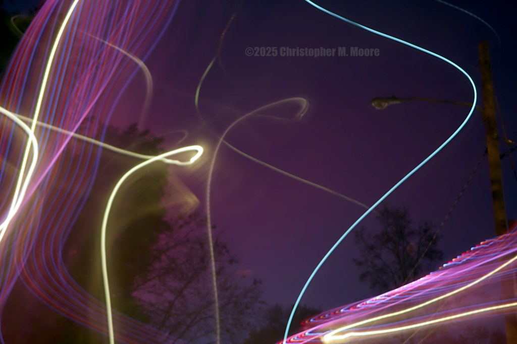 So, as an artist, I sometimes feel the need to make fun of myself just a little bit. Being outside trying to take pictures of the the rare display of northern lights, I suddenly found myself in a bind. I was doing very slow (20-30 second) exposures of the sky to try and get as much solar flare as my camera could capture. I’m outside taking my pictures, when suddenly, up ahead in the distance, I saw headlights. A car was coming, so I had to get out of the street. I picked up my tripod and moved out of their way. What I didn’t know is that the whole time my shutter was open.
